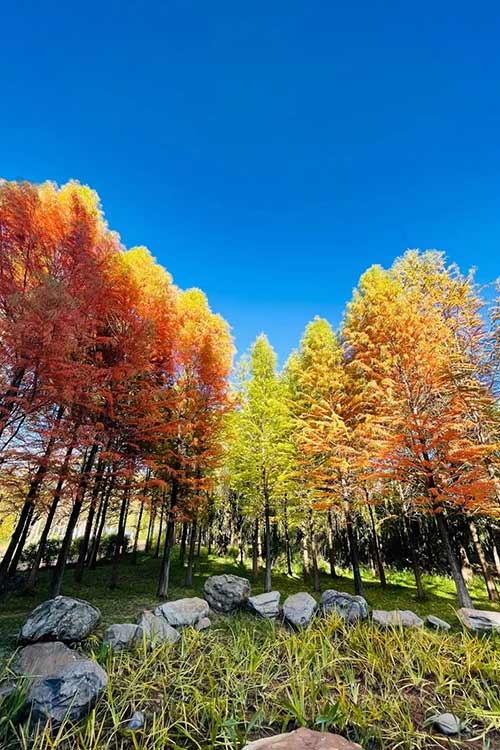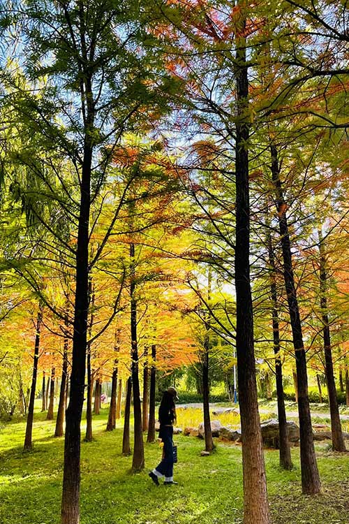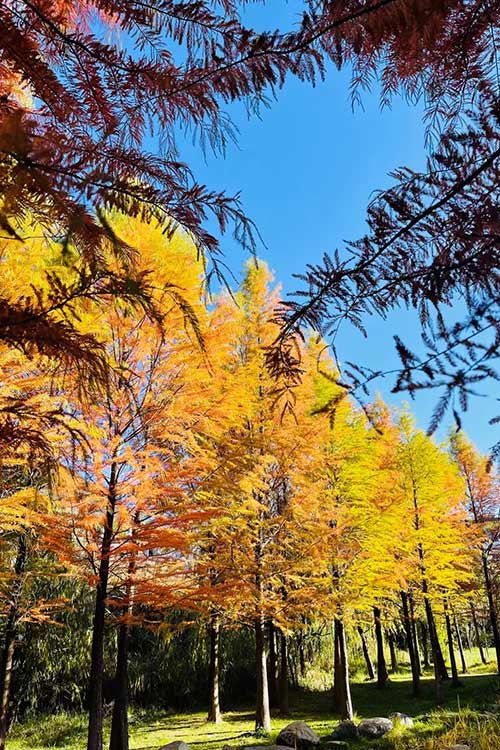 丽江初冬的暖阳还是那么的热情,天还是最清澈的湛蓝,年复一年的杉树林小伙伴们,早早的就列队等着我。原本翠绿色的杉叶换成一袭古铜色,火红黄绿交错的红杉树,在阳光下斑驳陆离,形成一道靓丽的风景线。(李婷拍摄)