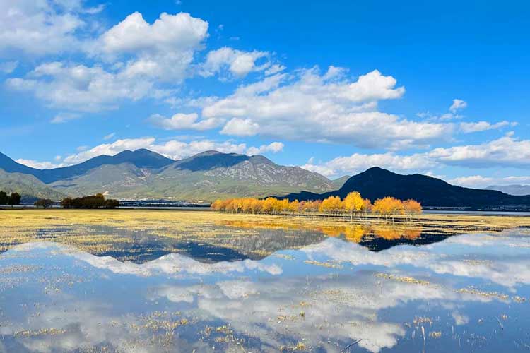 拉市海的湖水,清澈见底、绿草依依、水中鱼虾嬉戏成群,周围环境宁静清幽,远处青···